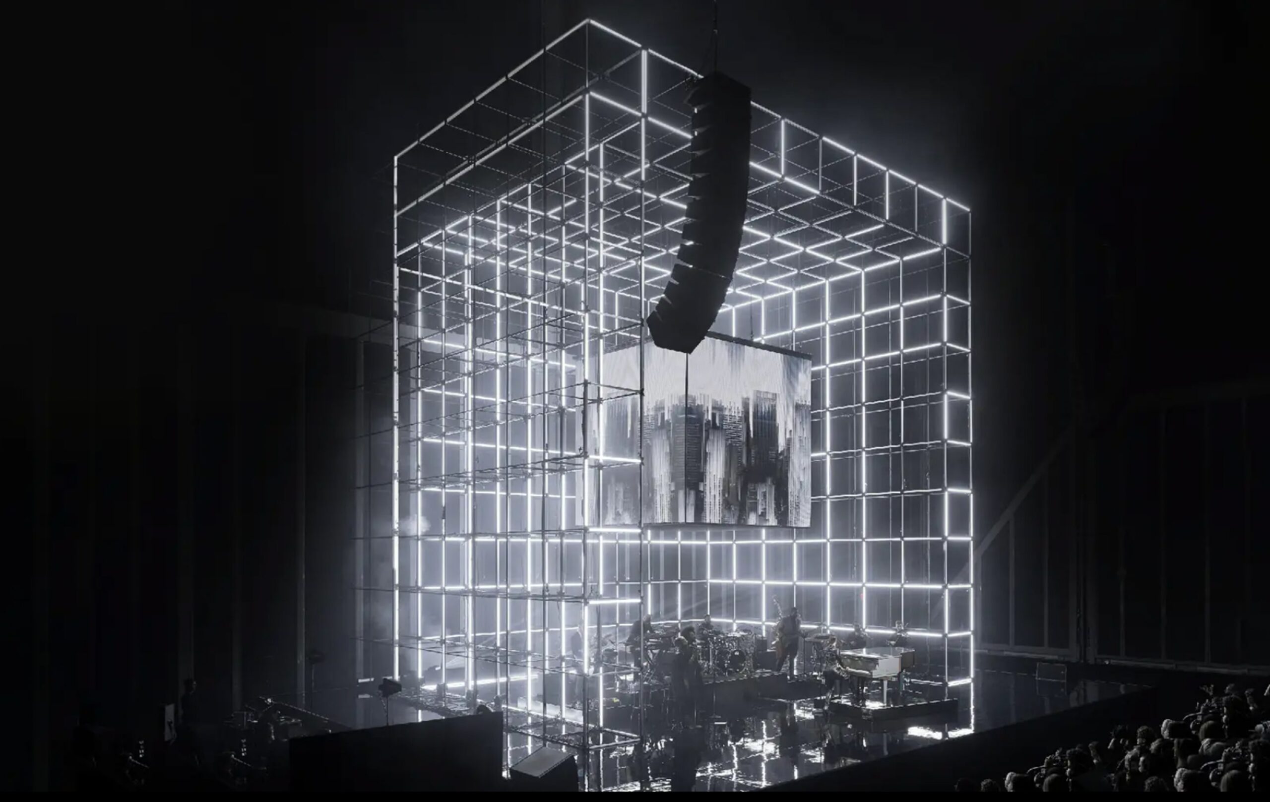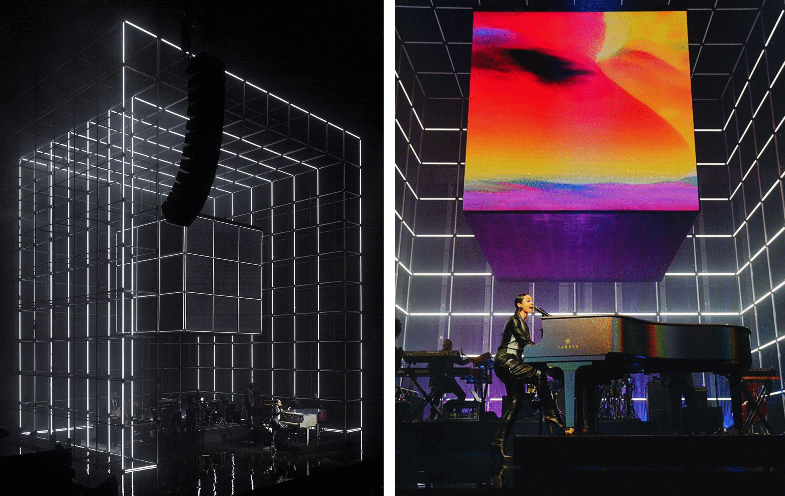 Layers of a Life Well-Lived” is a glowing cube of scaffolding animated by audio-reactive light tubes, each layer symbolizing personal growth, culture, and depth. At its core, a black square screen—echoing the Centurion symbol—displays vivid visuals that amplify Alicia Keys’ performance and embody the Centurion story. The structure feels alive and expansive, offering a dynamic, multisensory experience that extends beyond the stage.